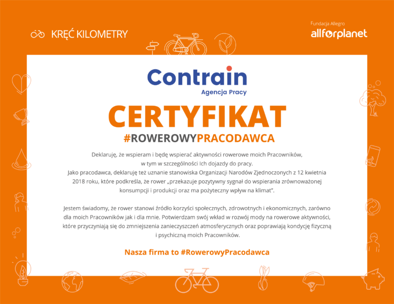 Ponad miesiąc temu rozpoczęliśmy rowerowe wyzwanie Train with Contrain – korzystając z rowerów firmowych zbieramy kilometry w specjalnej, dedykowanej aplikacji mobilnej. Zabawa została doceniona nie tylko przez uczestników, ale została też zauważona na zewnątrz! Postanowiliśmy oficjalnie zadeklarować poparcie dla przejazdów rowerowych naszych pracowników.